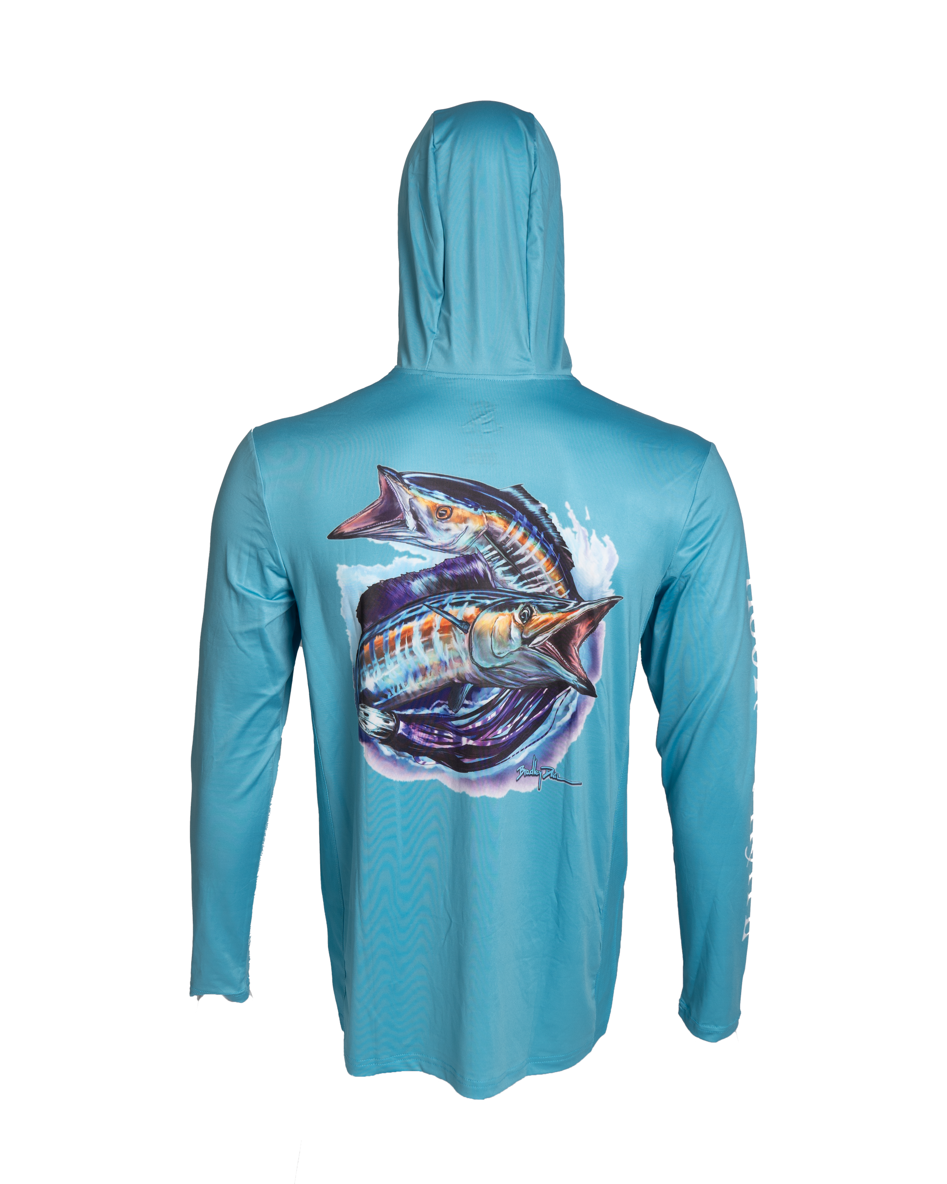 Protect yourself from the sun while staying comfortable and stylish with our Blue Long Sleeve Hoodie. With UPF protection and a built-in facemask, you can enjoy the outdoors without worry. The side mesh provides additional ventilation for ultimate comfort. Stay safe and cool in this functional hoodie. Select from our Wahoo or Mahi-Mahi designs by Bradley Deal.