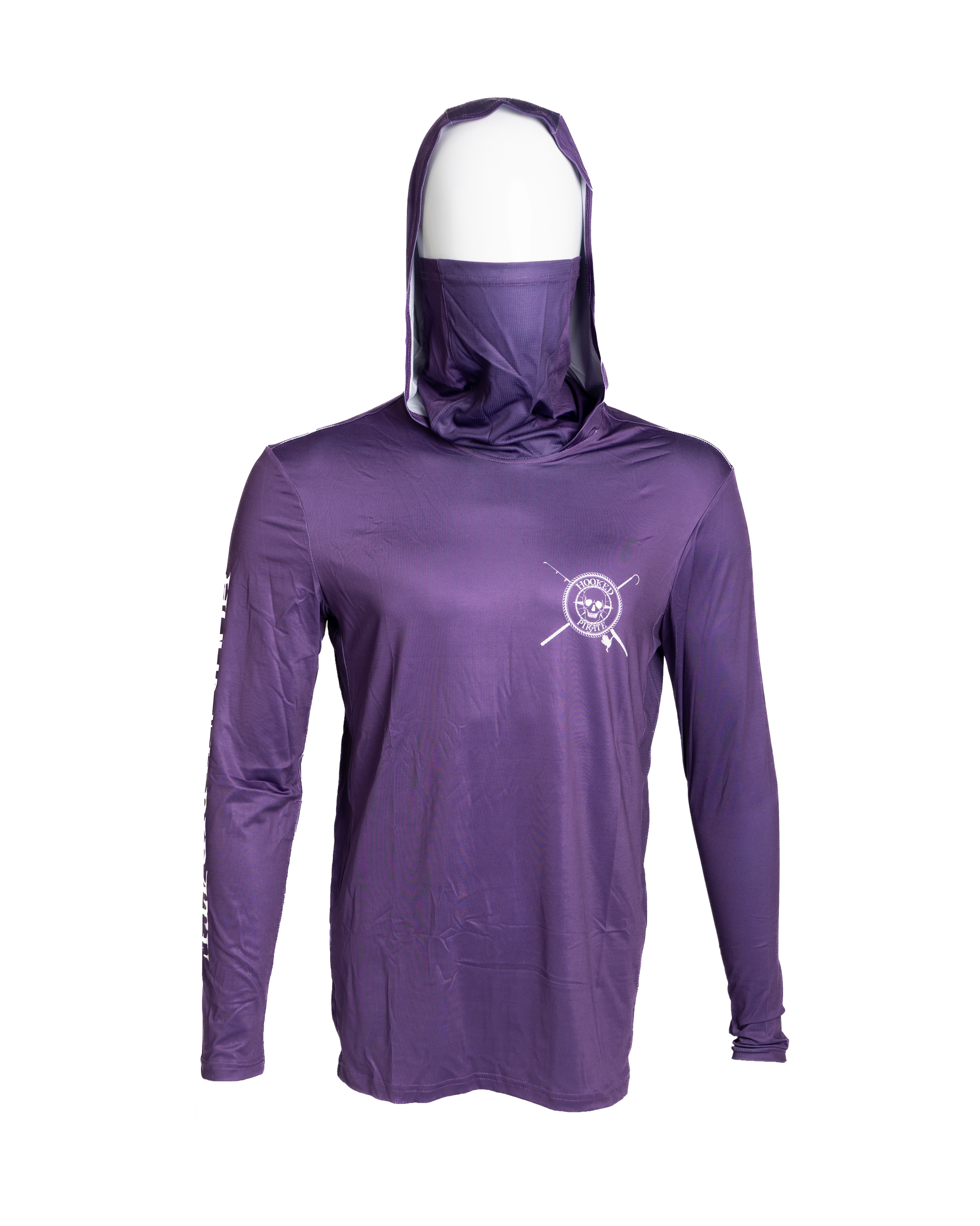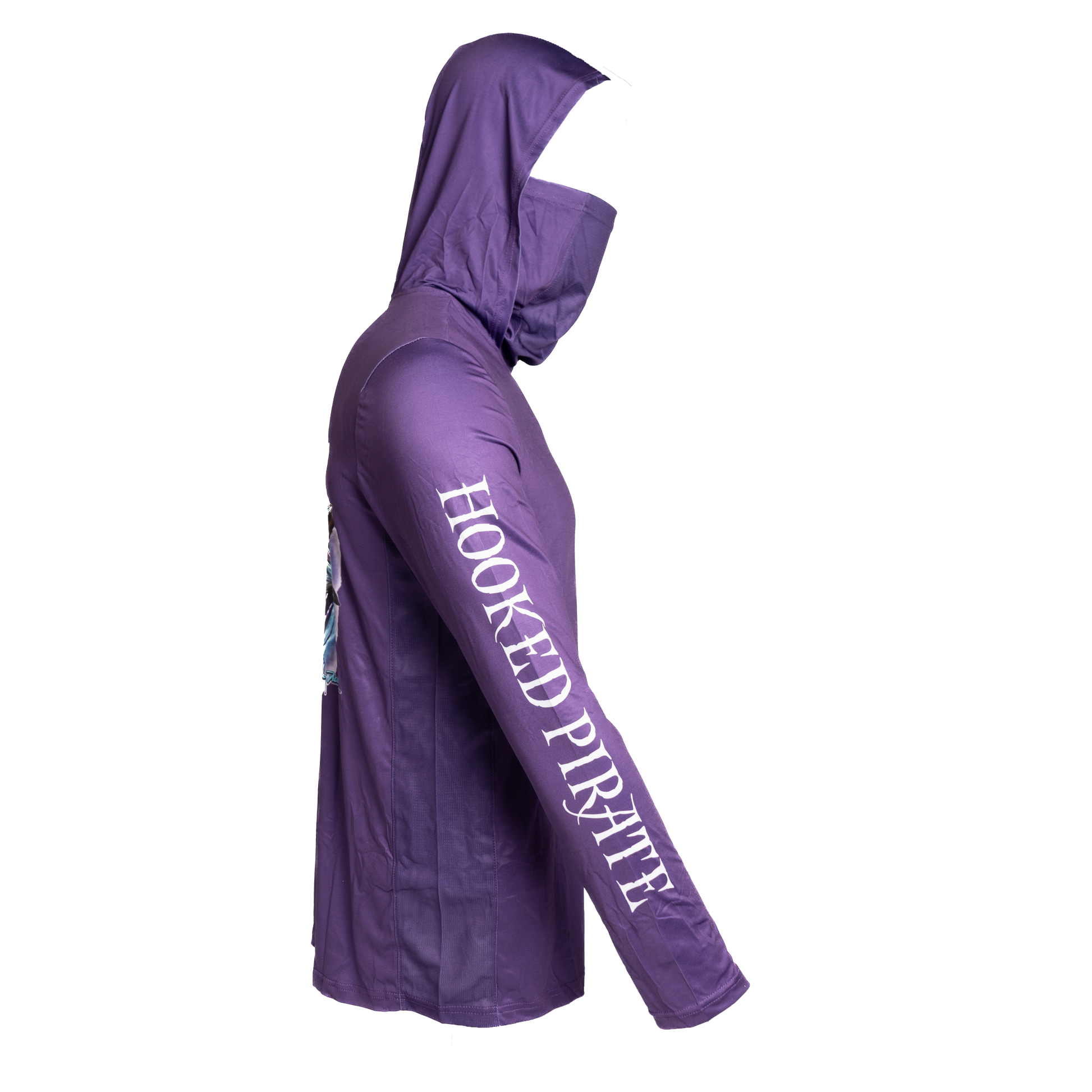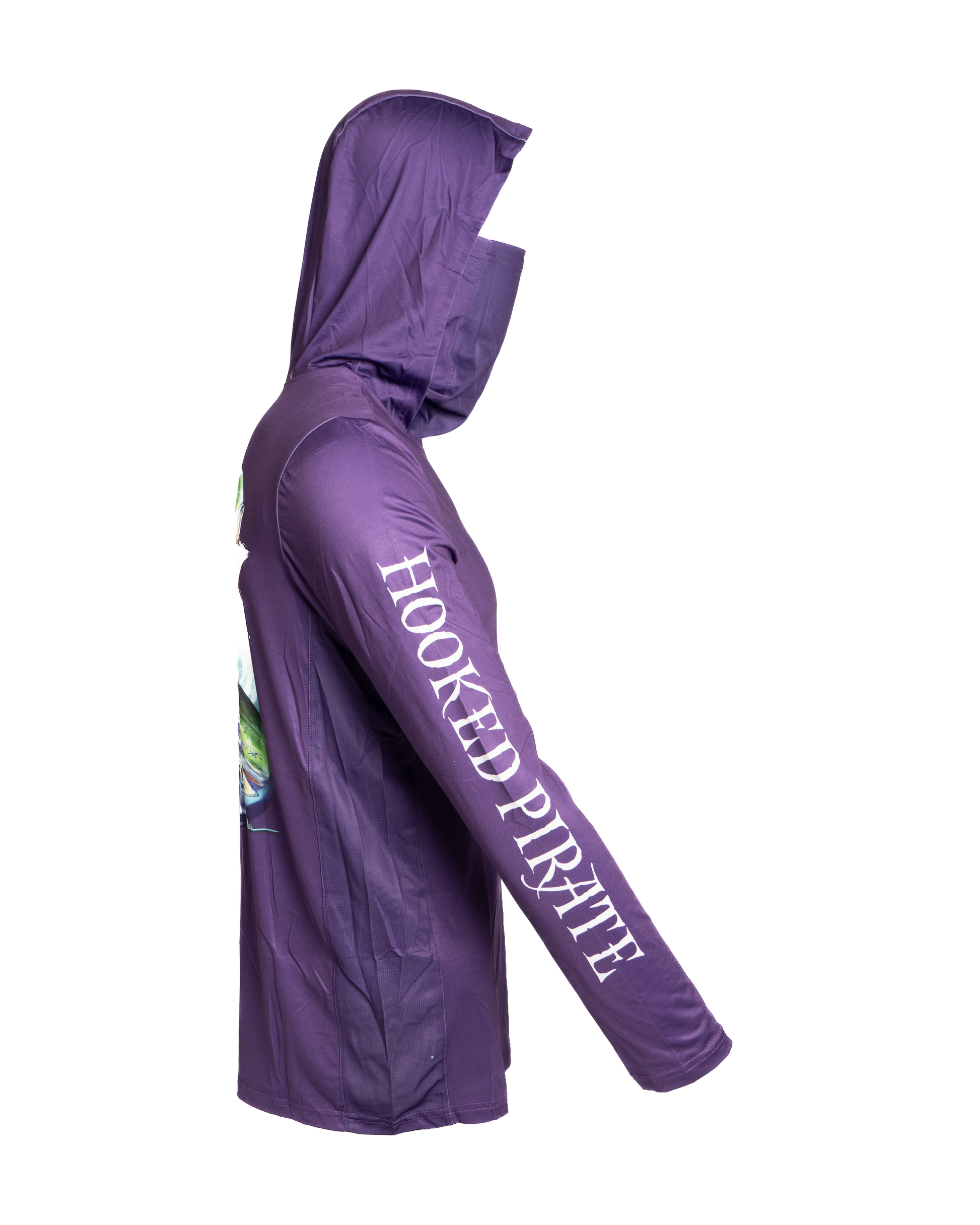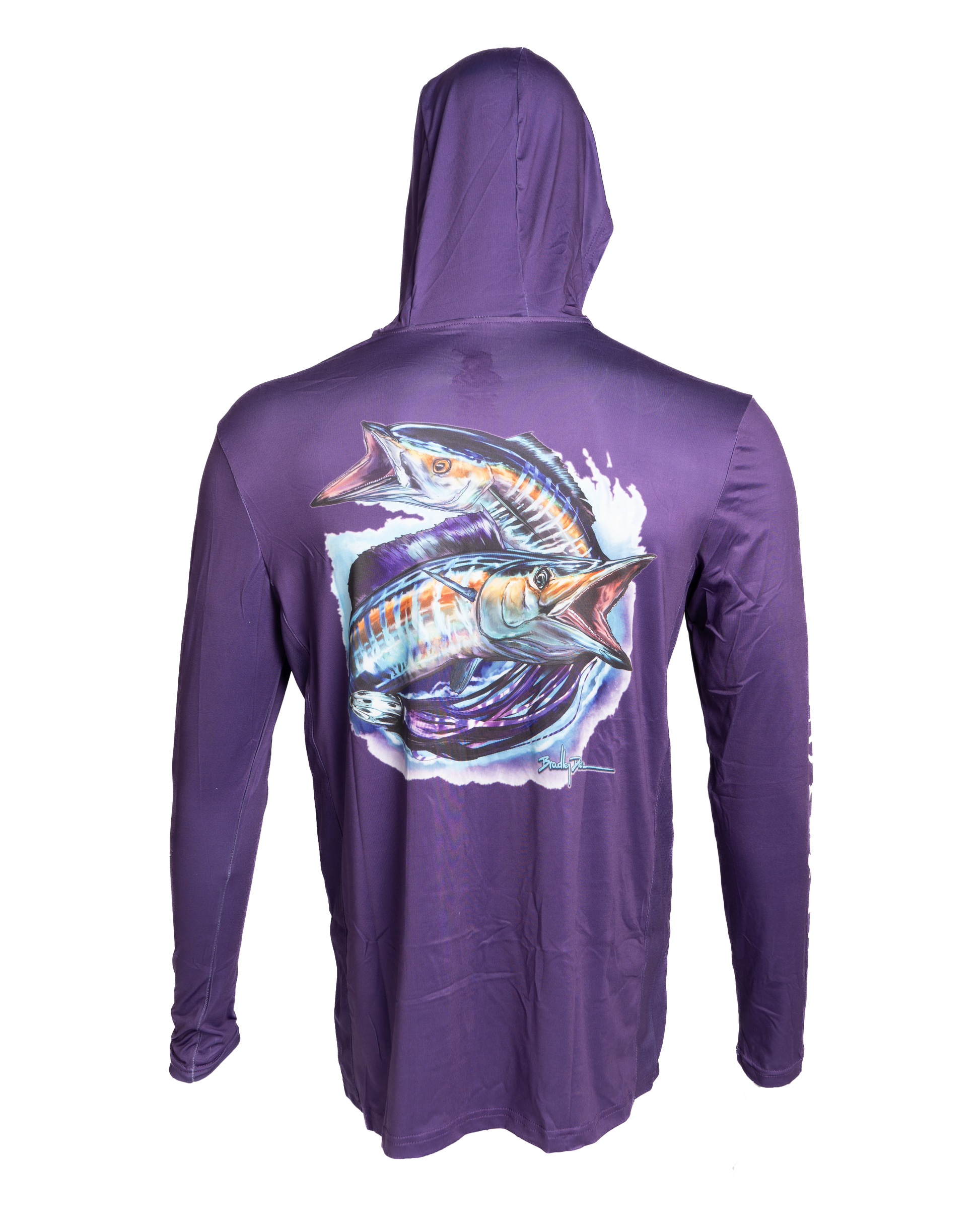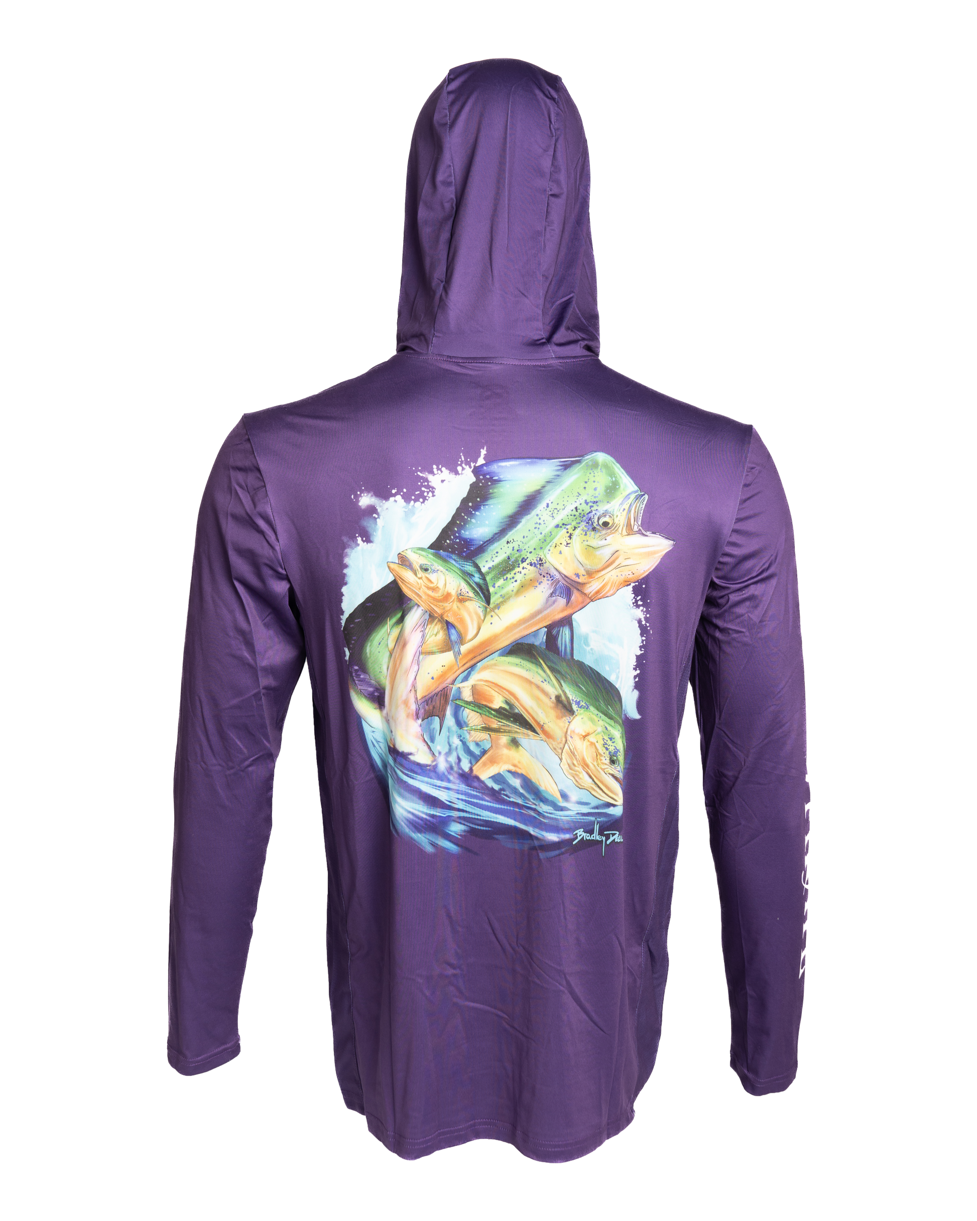 Protect yourself from the sun while staying comfortable and stylish with our Purple Long Sleeve Hoodie. With UPF protection and a built-in facemask, you can enjoy the outdoors without worry. The side mesh provides additional ventilation for ultimate comfort. Stay safe and cool in this functional hoodie. Select from our Wahoo or Mahi-Mahi designs by Bradley Deal.